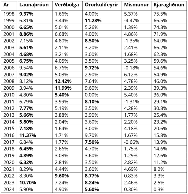 Taflan sýnir þróun launa, verðbólgu og örorkulífeyris á árunum 1998 til 2024. Einnig er sýndur mismunur á milli örorkulífeyris og verðbólgu, ásamt svokallaðri kjaragliðnun, sem segir til um hversu mikið örorkulífeyrir hefur dregist aftur úr launaþróun og verðbólgu. Allar tölur eru í prósentum. Á árunum 1998 til 2001 hækkuðu laun verulega, eða á bilinu 6,6% til 9,4%. Verðbólga var lægri en launaþróunin þessi ár, en hækkun örorkulífeyris hélt ekki alltaf í við. Uppsöfnuð kjaragliðnun var á bilinu 70% til 75% á frá árunum 2001 til 1998. Á tímabilinu 2002 til 2005 voru lífeyrishækkanir breytilegar og yfirleitt undir launaþróun. Uppsöfnuð kjaragliðnun jókst úr 60% árið 2005 í 66% árið 2003. Á árunum 2006 til 2009 urðu miklar launahækkanir og mikil verðbólga. Sérstaklega má nefna árið 2008 þegar verðbólgan náði 12,4%. Örorkulífeyrir hækkaði þó nokkuð, sérstaklega árið 2009, og hélt að einhverju leyti í við verðbólgu. Uppsöfnuð kjaragliðnun jókst úr 39,3% árið 2009 í 46% árið 2008. Árið 2010 var engin hækkun á örorkulífeyri, þrátt fyrir 5,4% verðbólgu, sem þýddi að raunvirði greiðslna minnkaði og kjaragliðnun jókst. Þessi þróun hélt áfram næstu ár með hægum bata. Á árunum 2011 til 2015 voru lífeyrishækkanir á bilinu 3 til 8%, en almenna launaþróunin var hærri. Árið 2015 var kjaragliðnun frá árinu 2024 komin í 20,6%. Á árunum 2016 til 2021 hækkaði örorkulífeyrir meira, sérstaklega árin 2016 og 2017. Uppsöfnuð kjaragliðnun fór úr 8,2% árið 2021 í 15,8% árið 2016. Frá árinu 2022 hefur uppsöfnuð kjaragliðnun frá 2024 verup 3,3%. Það má einnig taka eftir að örorkulífeyrir hefur ekki alltaf haldist í hendur við verðbólgu. Á árunum 2001, 2004, 2005, 2007, 2010 og 2022 var hækkun lífeyris lægri en verðbólga, sem þýðir að raunvirði greiðslna lækkaði. Heildarniðurstaðan sýnir að örorkulífeyrir hefur yfir langan tíma ekki hækkað í takt við laun, en síðustu ár hafa orðið marktækar breytingar til batnaðar. Sérstaklega á árunum 2022 til 2024, þar sem bilið milli launa og lífeyris hefur lækkað töluvert.