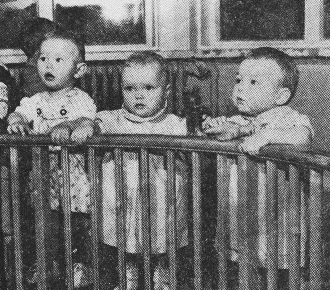 Myndin sýnir þrjú ung börn á vöggustofu Reykjavíkurborgar, Hlíðarenda. Morgunblaðið, 24. desember 1954. Timarit.is