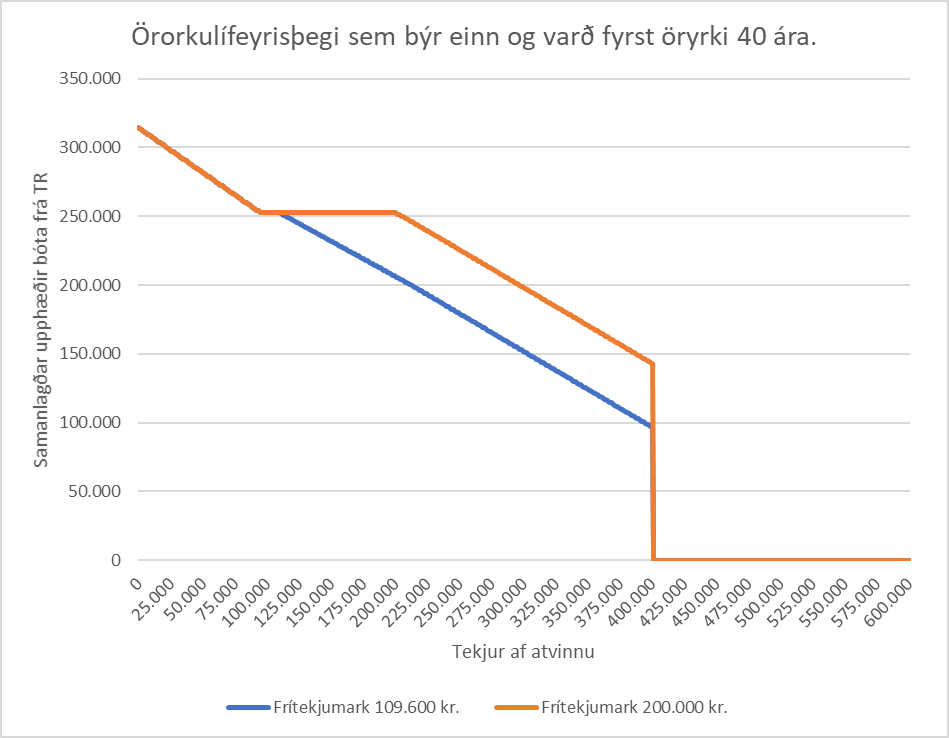 Línuritið hér fyrir neðan sýnir bótarétt örorkulífeyrisþega sem varð fyrst öryrki 40 ára gamall ef hann er einungis með atvinnutekjur.