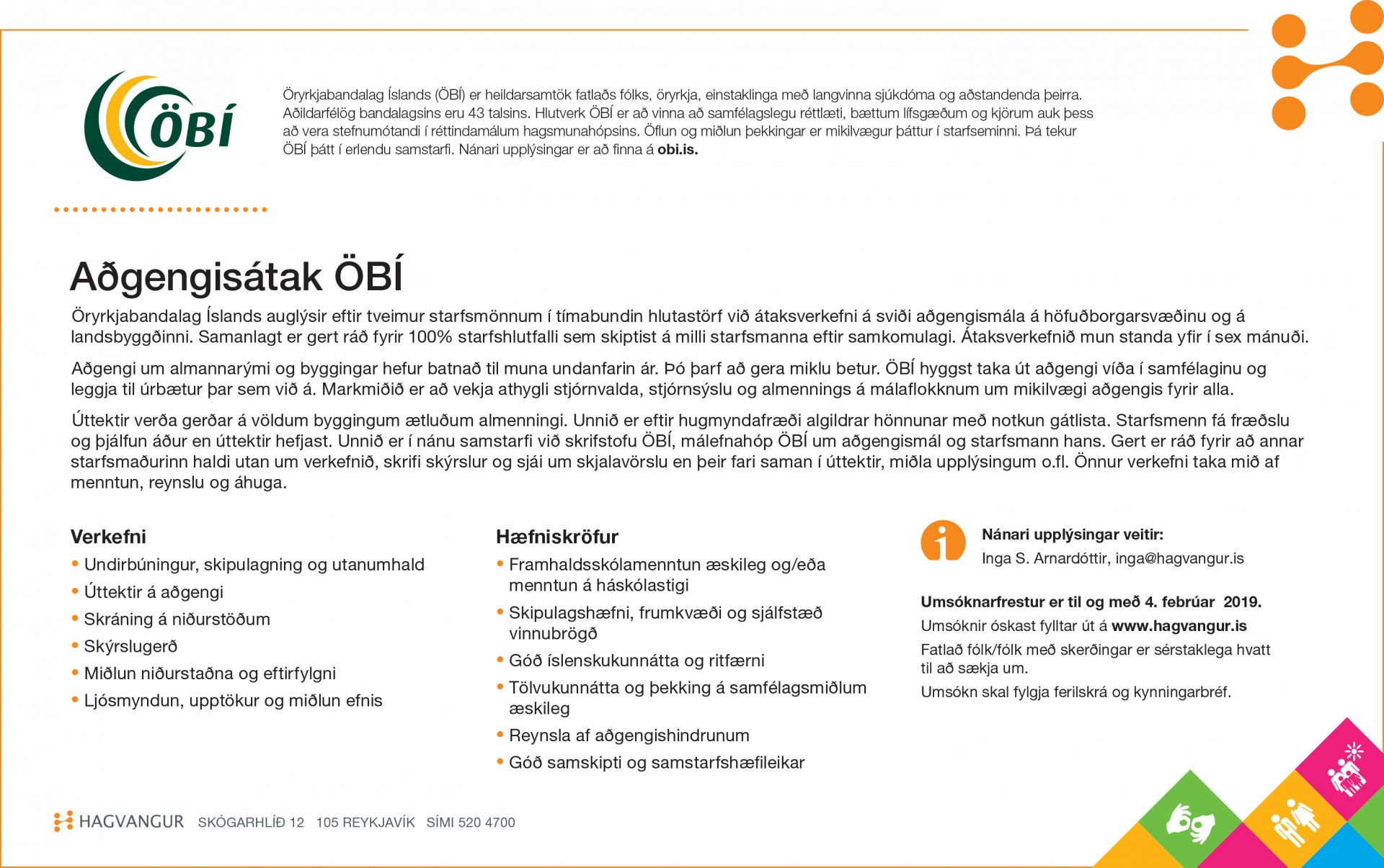 Öryrkjabandalag Íslands auglýsir eftir tveimur starfsmönnum í tímabundin hlutastörf við átaksverkefni á sviði aðgengismála á höfuðborgarsvæðinu og á landsbyggðinni. Samanlagt er gert ráð fyrir 100% starfshlutfalli sem skiptist á milli starfsmanna eftir samkomulagi. Átaksverkefnið mun standa yfir í sex mánuði.