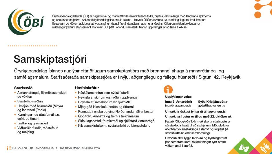 Öryrkjabandalag Íslands auglýsir eftir öflugum samskiptastjóra með brennandi áhuga á mannréttinda- og samfélagsmálum. Starfsaðstaða samskiptastjóra er í nýju, aðgengilegu og fallegu húsnæði í Sigtúni 42, Reykjavík.