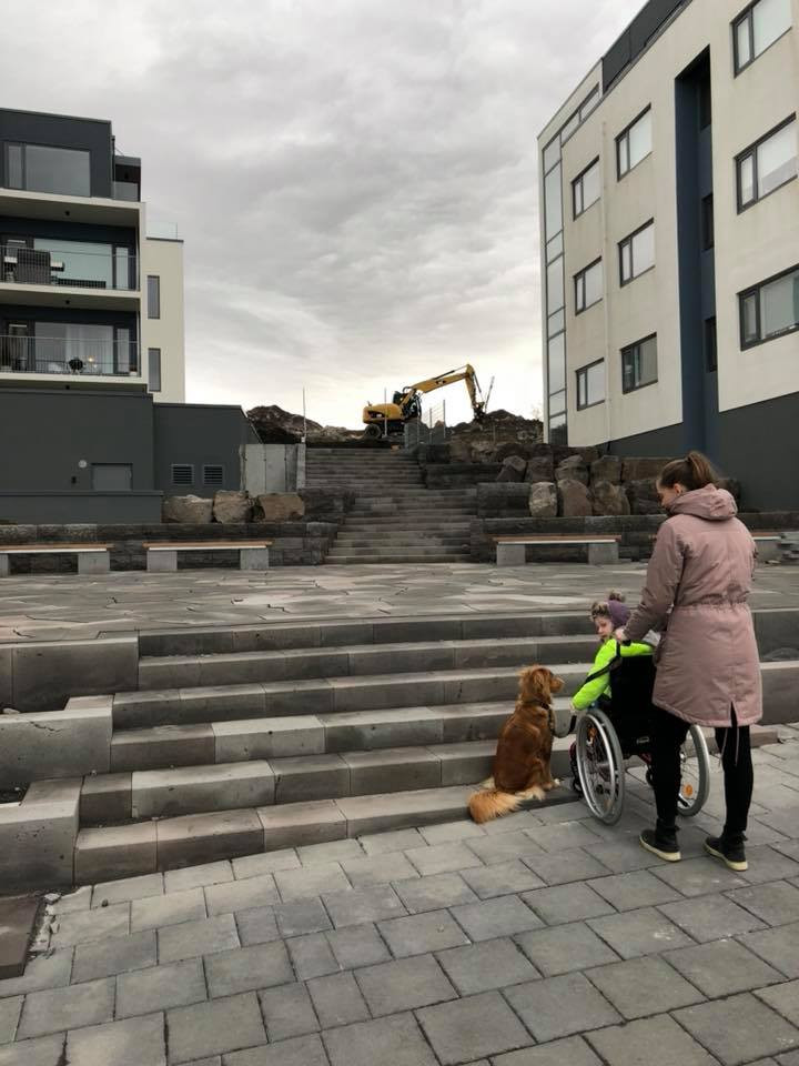 „Ótrúlega flottar þessar tröppur sem er verið að setja upp hliðina húsinu okkar. Þessar tröppur liggja einmitt að göngustígnum að skólanum sem Halldóra María mun væntanlega fara í.“