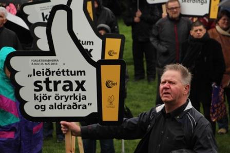 Krefjumst þess að lífeyrisþegar fái afturvirka hækkun eins og aðrir þjóðfélagsþegnar og að hækkunin verði að lágmarki í samræmi við krónutöluhækkun lægstu launa í maí síðastliðnum.Í fjárlagafrumvarpi ársins 2016 er gert ráð fyrir að lífeyrir almannatrygginga hækki frá 1. janúar 2016 um 9,4%. Sú hækkun myndi skila lífeyrisþegum rúmlega 13 þúsund króna hærri ráðstöfunartekjum mánaðarlega að hámarki. Lægstu laun hækkuðu um 31.000 kr. (fyrir skatt) frá 1. maí 2015.