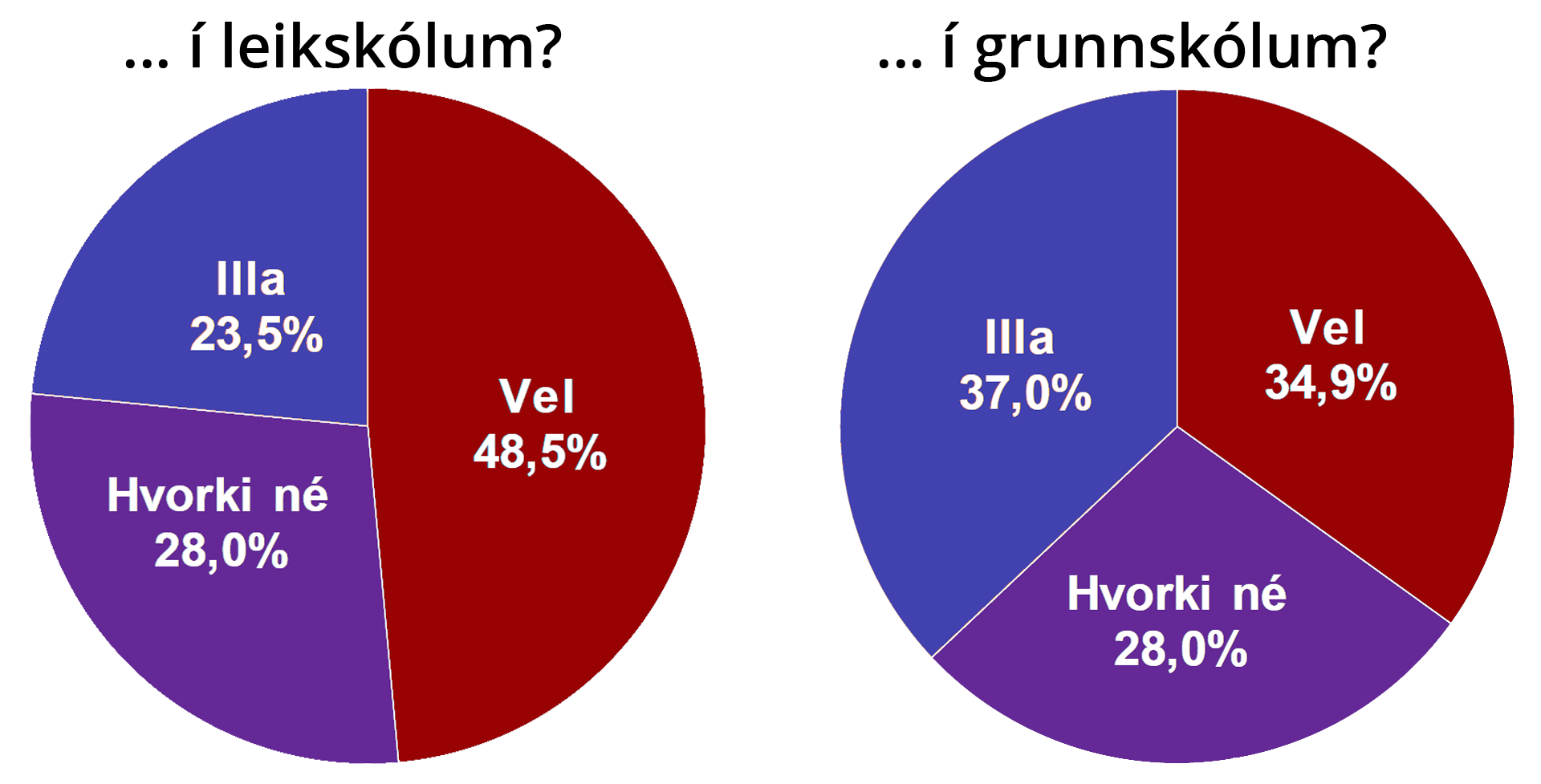 Það er aðeins annað upp á teningnum þegar kemur að grunnskóla. Þar telja aðeins 32% svarenda að grunnskólar séu að standa sig frekar vel, en 29,9% að þeir séu að standa sig frekar illa. Hlutfall þeirra sem svara með hvorki né, er það sama á báðum skólastigum. Hér eru það því 37% svarenda sem telja að grunnskólar séu að standa sig illa þegar kemur að þessu viðfangsefni, en aðeins 34,9% að þeir séu að standa sig vel.
