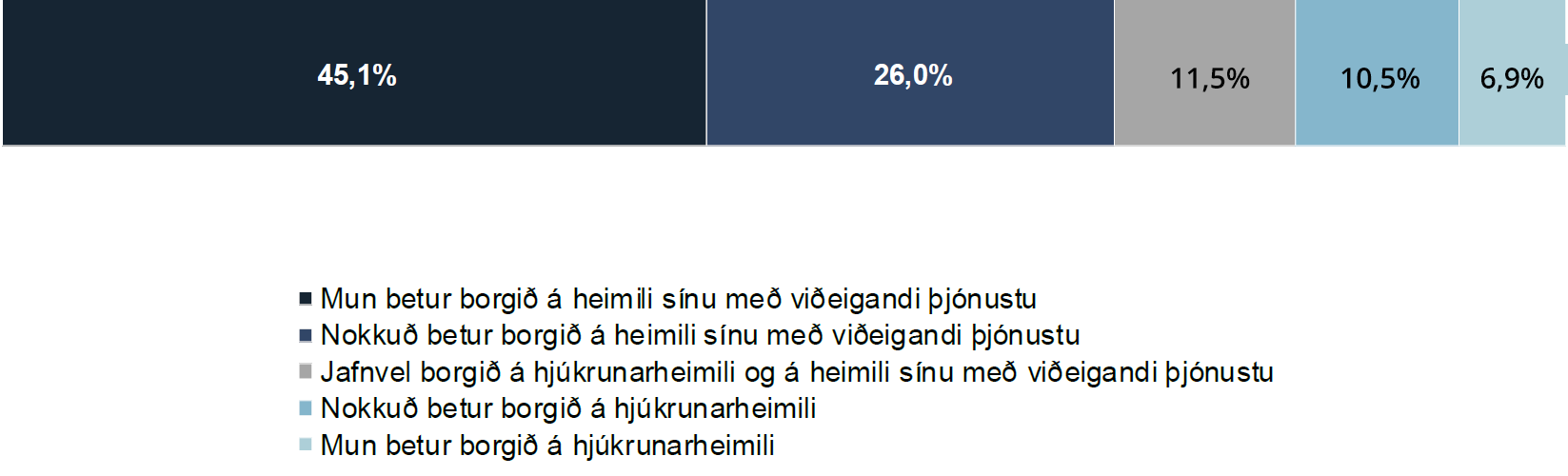 Svörin voru nokkuð eindregin. 45,1% töldu fötluðu fólki mun betur borgið á eigin heimili og 26% nokkuð betur borgið á eigin heimili með viðeigandi þjónustu. Samanlagt eru það því rúm 71% sem taka þessa afstöðu til málsins, en aðeins 17,4% telja þeim betur borgið á hjúkrunarheimili. 11,5% eru hlutlaus.