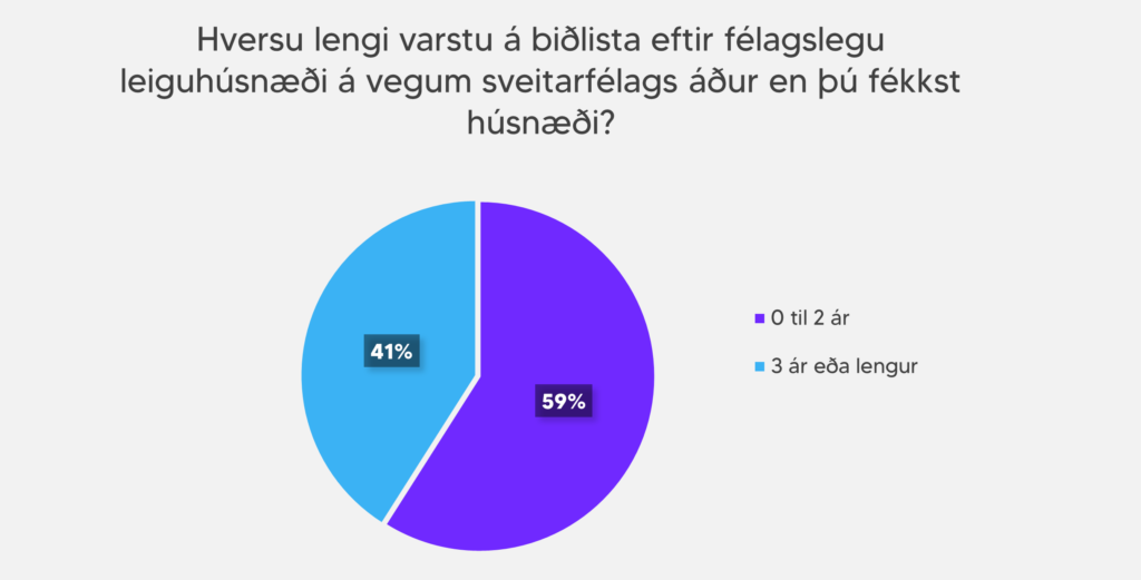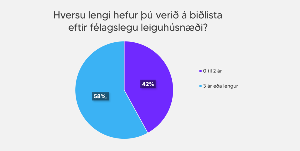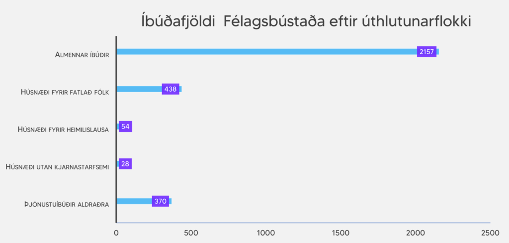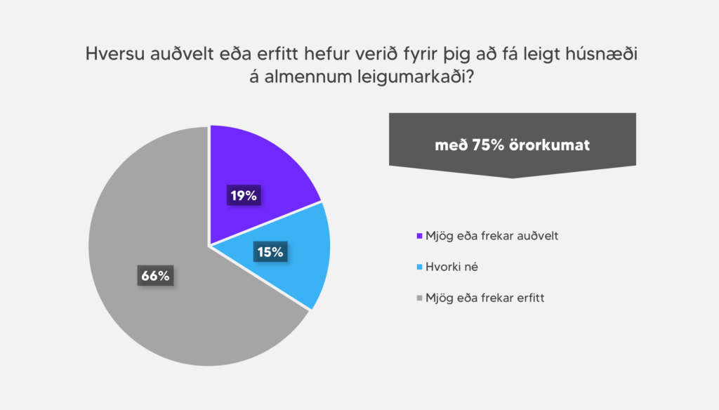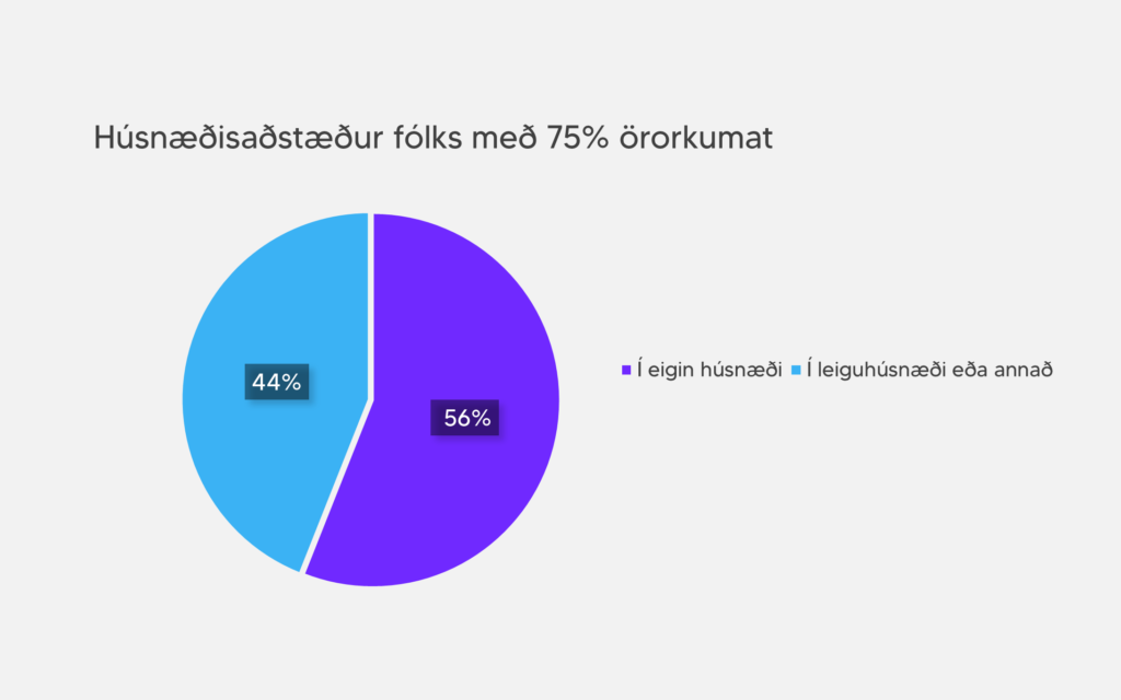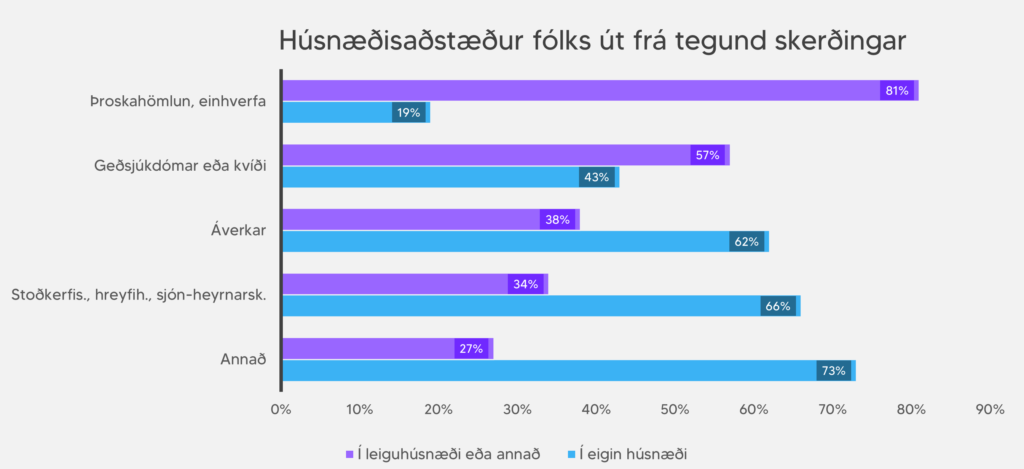 Á myndinni er súlurit sem sýnir húsnæðisaðstæður fólks út frá tegund skerðingar, hvort fólk búi í eigin húsnæði eða leighúsnæði. Skerðingarnar skiptast í 5 flokka. 1. flokkur er þroskahömlun og einhverfa, af þeim býr 81% í leiguhúsnæði eða öðru og 19% í eigin húsnæði. 2. flokkur eru geðsjúkdómar eða kvíði, af þeim búa 57% í leiguhúsnæði eða öðru og 43% í eigin húsnæði. 3. flokkur eru áverkar, af þeim búa 38% í leiguhúsnæði eða öðru og 62% í eigin húsnæði. 4. flokkur eru stoðkerfisvandamál, hreyfihömlun, sjónskerðinga eða heyrnarskerðing, af þeim búa 34% í leiguhúsnæði eða öðru og 66% í eigin húsnæði. 5. flokkur er annað, af þeim búa 27% í leiguhúsnæði eða öðru og 73% í eigin húsnæði.