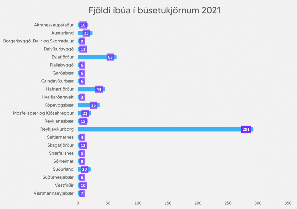 Á myndinni er súlurit sem sýnir fjölda íbúa í búsetukjörnum 2021 eftir 21 sveitarfélagi og 1 samfélagi. Í Akraneskaupstað búa 16 íbúar í búsetukjörnum, á Austurlandi eru þeir 23, í Borgarbyggð, Dölum og Skorradal 9, í Dalvíkurbyggð 11, Í Eyjafirði 63, í Fjallabyggð 6, í Garðabæ 6, í Grindavíkurbæ 6, í Hafnarfirði 44, í Hvalfjarðarsveit 3, í Kópavogsbæ 35, í Mosfellsbæ og Kjósahreppi 21, í Reykjanesbæ 15, í Reykjavíkurborg 291, á Seltjarnarnesi 4, í Skagafirði 12, á Snæfellsnesi 5, á Sólheimum 8, á Suðurlandi 20, í Suðurnesjabæ 6, á Vestfjörðum 10 og í Vestmannaeyjabæ 7.