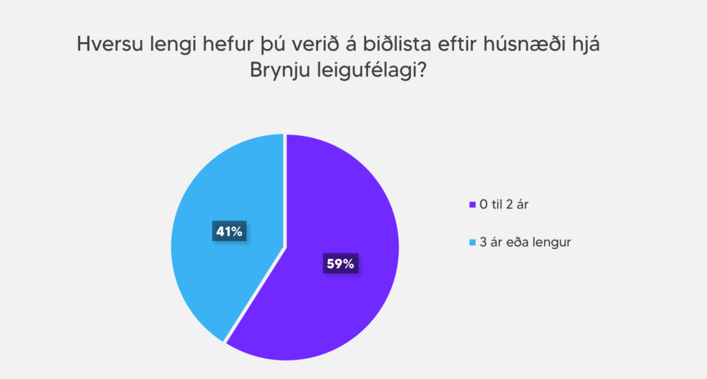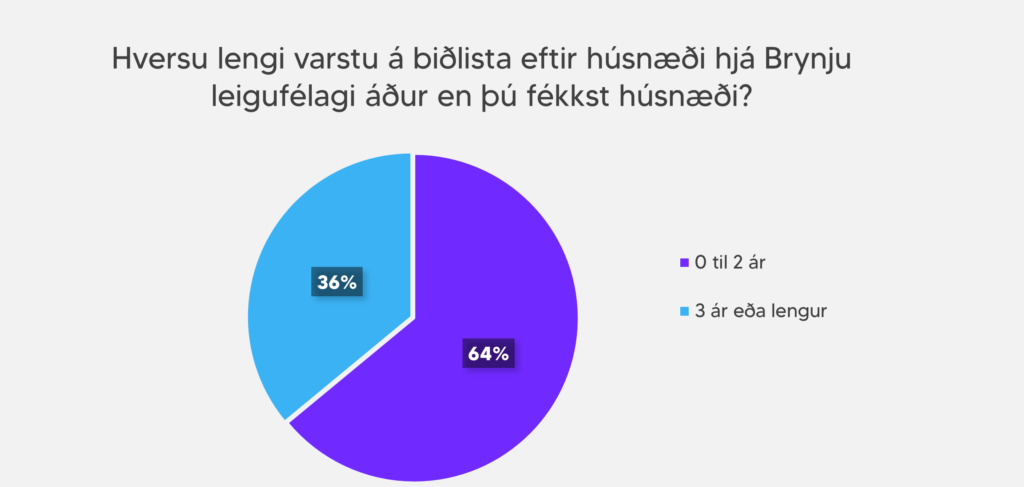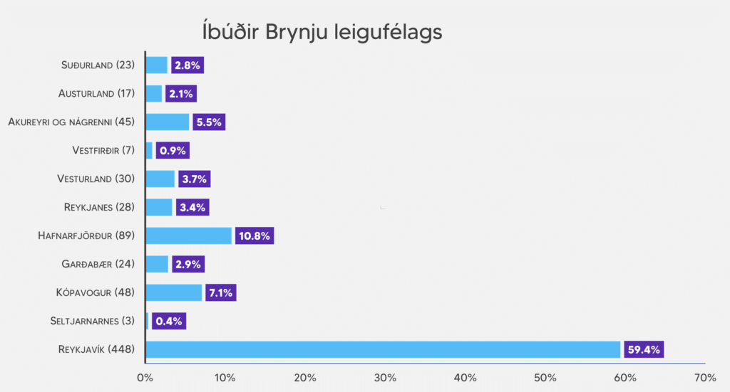 Á myndinni er súlurit sem sýnir fjölda íbúða Brynju leigufélags eftir 11 sveitarfélögum og landshlutum. Á Suðurlandi á Brynja 23 íbúðir sem gera 2,8% eignasafnsins, á Austurlandi eru 17 íbúðir eða 2,1%, á Akureyri og nágrenni eru 45 íbúðir eða 5,5%, á Vestfjörðum eru 7 íbúðir eða 0,9%, á Vesturlandi eru 30 íbúðir eða 3,7%, á Reykjanesi eru 28 íbúðir eða 3,4%, í Hafnarfirði eru 89 íbúðir eða 10,8%, í Garðabæ eru 24 íbúðir eða 2,9%, í Kópavogi eru 48 íbúðir eða 7,1%, á Seltjarnarnesi eru 3 íbúðir eða 0,4% og í Reykjavík eru 448 íbúðir eða 59,4%.
