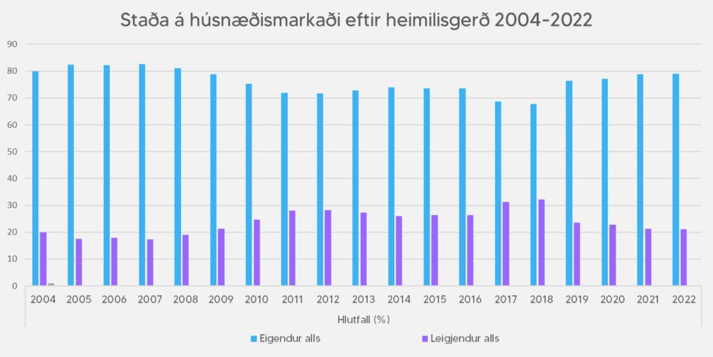 Á myndinni er súlurit yfir stöðu á húsnæðismarkaði eftir heimilisgerð, það er eigendur og leigjendur frá 2004 til 2022 samkvæmt Hagstofu Íslands, sem sýnir hlutfall í prósentum. Árið 2004 er hlutfall eigenda 80% og leigjenda 20%. Árin 2005 til 2007 er hlutfall eigenda um 82% og leigjenda 18% Árið 2008 er hlutfall eigenda 81% og leigjenda 19%. 2009 er hlutfall eigenda um 79% og leigjenda 21%. 2010 er hlutfall eigenda um 75% og leigjenda 25%. 2011 og 2012 er hlutfall eigenda um 72% og leigjenda 28%. 2013 er hlutfall eigenda um 73% og leigjenda 27%. 2014 er hlutfall eigenda 74% og leigjenda 26%. 2015 og 2016 er hlutfall eigenda um 74% og leigjenda 26%. 2017 er hlutfall eigenda um 69% og leigjenda 31%. 2018 er hlutfall eigenda um 68% og leigjenda 32%. 2019 og 2020 er hlutfall eigenda um 77% og leigjenda 23%. 2021 og 2022 er hlutfall eigenda um 79% og leigjenda 21%.
