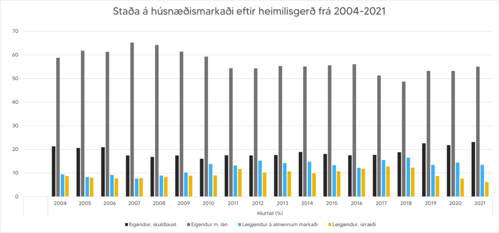 Á myndinni er súlurit yfir stöðu á húsnæðismarkaði eftir heimilisgerð frá 2004 til 2021 samkvæmt Hagstofu Íslands, sem sýnir hlutfall í prósentum. Súlurnar eru 4 og sýna eigendur skuldlaust, eigendur með lán, leigjendur á almennum markaði og leigjendur í úrræði. 2004 eru skuldlausir eigendur 21,3%, eigendur með lán 58,8%, leigjendur á almennum markaði 9,4% og leigjendur í úrræði 8,7%. 2005 eru skuldlausir eigendur 20,6%, eigendur með lán 61,8%, leigjendur á almennum markaði 8,3% og leigjendur í úrræði 8,1%. 2006 eru skuldlausir eigendur 20,9%, eigendur með lán 61,3%, leigjendur á almennum markaði 9,2% og leigjendur í úrræði 7,7%. 2007 eru skuldlausir eigendur 17,4%, eigendur með lán 65,2%, leigjendur á almennum markaði 7,6% og leigjendur í úrræði 7,8%. 2008 eru skuldlausir eigendur 16,8%, eigendur með lán 64,2%, leigjendur á almennum markaði 8,9% og leigjendur í úrræði 8,3%. 2009 eru skuldlausir eigendur 17,4%, eigendur með lán 61,4%, leigjendur á almennum markaði 10,2% og leigjendur í úrræði 8,9%. 2010 eru skuldlausir eigendur 16%, eigendur með lán 59,3%, leigjendur á almennum markaði 13,8% og leigjendur í úrræði 9%. 2011 eru skuldlausir eigendur 17,5%, eigendur með lán 54,4%, leigjendur á almennum markaði 13,2% og leigjendur í úrræði 11,7%. 2012 eru skuldlausir eigendur 17,4%, eigendur með lán 54,3%, leigjendur á almennum markaði 15,2% og leigjendur í úrræði 10,2%. 2013 eru skuldlausir eigendur 17,6%, eigendur með lán 55,3%, leigjendur á almennum markaði 14,2% og leigjendur í úrræði 10,7%. 2014 eru skuldlausir eigendur 18,9%, eigendur með lán 55,1%, leigjendur á almennum markaði 14,8% og leigjendur í úrræði 9,9%. 2015 eru skuldlausir eigendur 18,1%, eigendur með lán 55,6%, leigjendur á almennum markaði 13,3% og leigjendur í úrræði 10,7%. 2016 eru skuldlausir eigendur 17,5%, eigendur með lán 56,1%, leigjendur á almennum markaði 12,2% og leigjendur í úrræði 11,8%. 2017 eru skuldlausir eigendur 17,7%, eigendur með lán 51,3%, leigjendur á almennum markaði 15,5% og leigjendur í úrræði 12,8%. 2018 eru skuldlausir eigendur 18,8%, eigendur með lán 48,7%, leigjendur á almennum markaði 16,5% og leigjendur í úrræði 12,3%. 2019 eru skuldlausir eigendur 22,6%, eigendur með lán 53,2%, leigjendur á almennum markaði 13,4% og leigjendur í úrræði 8,7%. 2020 eru skuldlausir eigendur 21,8%, eigendur með lán 53,2%, leigjendur á almennum markaði 14,5% og leigjendur í úrræði 7,6%. 2021 eru skuldlausir eigendur 23,1%, eigendur með lán 55%, leigjendur á almennum markaði 13,4% og leigjendur í úrræði 6,2%.