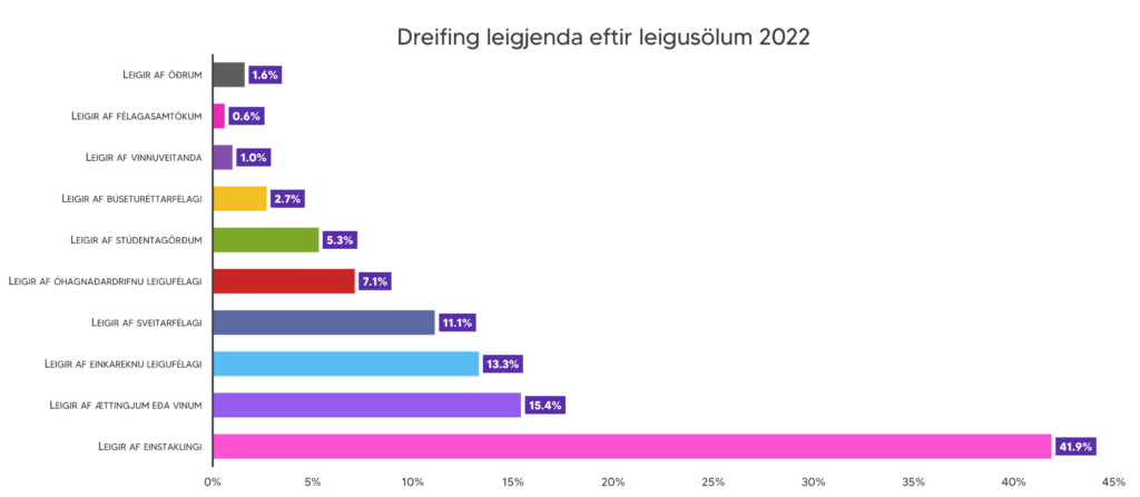 Á myndinni er súlurit yfir dreifingu leigjenda eftir 10 tegundum leigusala árið 2022. Tölur eru fengnar úr leigumarkaðskönnun Húsnæðis- og mannvirkjastofnunar. 1,6% leigjenda leigja af öðrum, 0,6% leigja af félagsamtökum, 1% leigir af atvinnuveitanda, 2,7% leigja af búseturéttarfélagi, 5,3% leigja af stúdentagörðum, 7,1% leigja af óhagnaðardrifnu leigufélagi, 11,1% leigja af sveitarfélagi, 13,3% leigja af einkareknu leigufélagi, 15,4% leigja af ættingjum eða vinum og 41,9% leigja af einstaklingum.