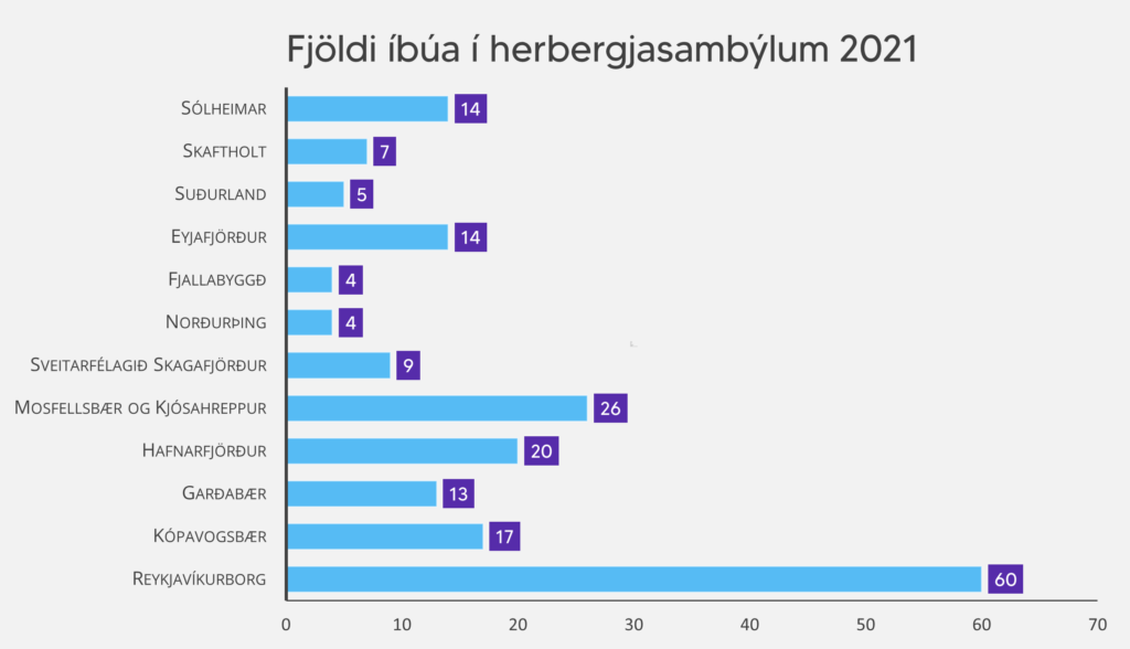 Á myndinni er súlurit sem sýnir fjölda íbúa í herbergjasambýlum 2021 eftir 10 sveitarfélögum og 2 samfélögum. Á Sólheimum búa 14 í herbergjasambýlum, í Skaftholti eru það 7, á Suðurlandi 5, í Eyjafirði 14, í Fjallabyggð 4, í Norðurþingi 4, í Sveitarfélaginu Skagafirði 9, í Mosfellsbæ og Kjósahreppi 26, í Hafnarfirði 20, í Garðabæ 13, í Kópavogsbæ 17 og í Reykjavíkurborg 60.