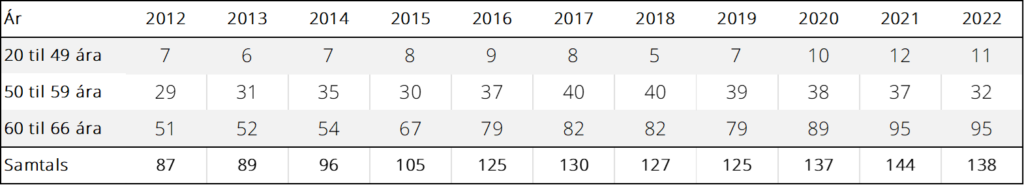 Á töflunni kemur fram fjöldi íbúa undir 67 ára aldri sem býr inni á hjúkrunarheimilum á árunum 2012 til 2022. Aldri íbúa er skipt í þrennt, 20 til 49 ára, 50 til 59 ára og 60 til 66 ára. Að lokum er sýnd samtala íbúa eftir árum. Árið 2012 eru 7 íbúar 20 til 49 ára, 29 íbúar 50 til 59 ára og 51 íbúi 60 til 66 ára, samtals 87 íbúar. 2013 eru 6 íbúar 20 til 49 ára, 31 íbúi 50 til 59 ára og 52 íbúar 60 til 66 ára, samtals 89 íbúar. 2014 eru 7 íbúar 20 til 49 ára, 35 íbúar 50 til 59 ára og 54 íbúar 60 til 66 ára, samtals 96 íbúar. 2015 eru 8 íbúar 20 til 49 ára, 30 íbúar 50 til 59 ára og 67 íbúar 60 til 66 ára, samtals 105 íbúar. 2016 eru 9 íbúar 20 til 49 ára, 37 íbúar 50 til 59 ára og 79 íbúar 60 til 66 ára, samtals 125 íbúar. 2017 eru 8 íbúar 20 til 49 ára, 40 íbúar 50 til 59 ára og 82 íbúar 60 til 66 ára, samtals 130 íbúar. 2018 eru 5 íbúar 20 til 49 ára, 40 íbúar 50 til 59 ára og 82 íbúar 60 til 66 ára, samtals 127 íbúar. 2019 eru 7 íbúar 20 til 49 ára, 39 íbúar 50 til 59 ára og 79 íbúar 60 til 66 ára, samtals 125 íbúar. 2020 eru 10 íbúar 20 til 49 ára, 38 íbúar 50 til 59 ára og 89 íbúar 60 til 66 ára, samtals 137 íbúar. 2021 eru 12 íbúar 20 til 49 ára, 37 íbúar 50 til 59 ára og 95 íbúar 60 til 66 ára, samtals 144 íbúar. 2022 eru 11 íbúar 20 til 49 ára, 32 íbúar 50 til 59 ára og 95 íbúar 60 til 66 ára, samtals 138 íbúar.