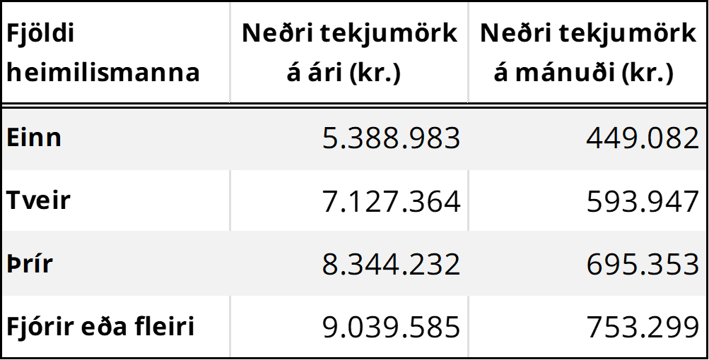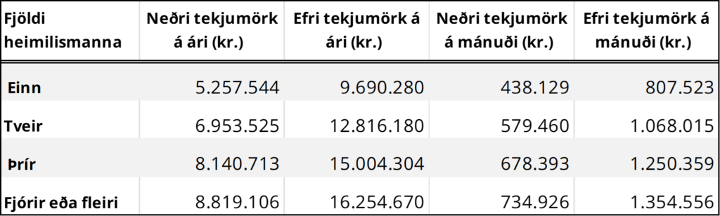 Á töflunni er yfirlit yfir tekju- og eignamörk húsnæðisbóta frá 1. janúar til 1. júlí 2023. Töflunni er skipt upp í 5 dálka, fjölda heimilismanna, neðri tekjumörk á ári, efri tekjumörk á ári, neðri tekjumörk á mánuði og efri tekjumörk á mánuði í krónum talið. Fjölda heimilismanna er skipt í fernt, það er einn, tveir, þrír og fjórir eða fleiri. Einn heimilismaður er með 5.257.544 kr. í neðri tekjumörk á ári, 9.690.280 kr. í efri tekjumörk á ári, 438.129 kr. í neðri tekjumörk á mánuði og 807.523 kr. í efri tekjumörk á mánuði. Tveir heimilismenn eru með 6.953.525 kr. í neðri tekjumörk á ári, 12.816.180 kr. í efri tekjumörk á ári, 579.460 kr. í neðri tekjumörk á mánuði og 1.068.015 kr. í efri tekjumörk á mánuði. Þrír heimilismenn eru með 8.140.713 kr. í neðri tekjumörk á ári, 15.004.304 kr. í efri tekjumörk á ári, 678.393 kr. í neðri tekjumörk á mánuði og 1.250.359 kr. í efri tekjumörk á mánuði. Fjórir eða fleiri heimilismenn eru með 8.819.106 kr. í neðri tekjumörk á ári, 16.254.670 kr. í efri tekjumörk á ári, 734.926 kr. í neðri tekjumörk á mánuði og 1.354.556 kr. í efri tekjumörk á mánuði.