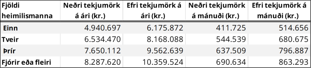 Á töflunni er yfirlit yfir viðmið félags- og vinnumarkaðsráðuneytisins um tekjumörk sérstaks húsnæðisstuðnings frá 1. júlí 2023. Töflunni er skipt upp í 5 dálka, fjölda heimilismanna, neðri tekjumörk á ári, efri tekjumörk á ári, neðri tekjumörk á mánuði og efri tekjumörk á mánuði í krónum talið. Fjölda heimilismanna er skipt í fernt, það er einn, tveir, þrír og fjórir eða fleiri. Einn heimilismaður er með 4.940.697 kr. í neðri tekjumörk á ári, 6.175.872 kr. í efri tekjumörk á ári, 411.725 kr. í neðri tekjumörk á mánuði og 514.656 kr. í efri tekjumörk á mánuði. Tveir heimilismenn eru með 6.534.470 kr. í neðri tekjumörk á ári, 8.168.088 kr. í efri tekjumörk á ári, 544.539 kr. í neðri tekjumörk á mánuði og 680.675 kr. í efri tekjumörk á mánuði. Þrír heimilismenn eru með 7.650.112 kr. í neðri tekjumörk á ári, 9.562.639 kr. í efri tekjumörk á ári, 637.509 kr. í neðri tekjumörk á mánuði og 796.887 kr. í efri tekjumörk á mánuði. Fjórir eða fleiri heimilismenn eru með 8.287.620 kr. í neðri tekjumörk á ári, 10.359.524 kr. í efri tekjumörk á ári, 690.634 kr. í neðri tekjumörk á mánuði og 863.293 kr. í efri tekjumörk á mánuði.