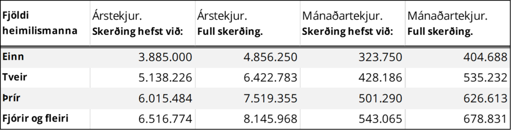 Á töflunni er yfirlit yfir tekjumörk sérstaks húsnæðisstuðnings Seltjarnarnesbæjar árið 2023. Töflunni er skipt í 5 dálka, fjölda heimilismanna, krónutala sem skerðing hefst við miðað við árstekjur, krónutala sem full skerðing hefst við miðað við árstekjur, krónutala sem skerðing hefst við miðað við mánaðartekjur og krónutala sem full skerðing hefst við miðað við mánaðartekjur. Fjölda heimilismanna er skipt í fernt, það er einn, tveir, þrír og fjórir eða fleiri. Hjá einum heimilismanni hefst skerðing miðað við árstekjur við 3.885.000 kr., full skerðing miðað við árstekjur við 4.856.250 kr., skerðing miðað við mánaðartekjur hefst við 323.750 kr. og full skerðing miðað við mánaðartekjur við 404.688 kr. Hjá tveimur heimilismönnum hefst skerðing miðað við árstekjur við 5.138.226 kr., full skerðing miðað við árstekjur við 6.422.783 kr., skerðing miðað við mánaðartekjur hefst við 428.186 kr. og full skerðing miðað við mánaðartekjur við 535.232 kr. Hjá þremur heimilismönnum hefst skerðing miðað við árstekjur við 6.015.484 kr., full skerðing miðað við árstekjur við 7.519.355 kr., skerðing miðað við mánaðartekjur hefst við 501.290 kr. og full skerðing miðað við mánaðartekjur við 626.613 kr. Hjá fjórum og fleiri heimilismönnum hefst skerðing miðað við árstekjur við 6.516.774 kr., full skerðing miðað við árstekjur við 8.145.968 kr., skerðing miðað við mánaðartekjur hefst við 543.065 kr. og full skerðing miðað við mánaðartekjur við 678.831 kr.