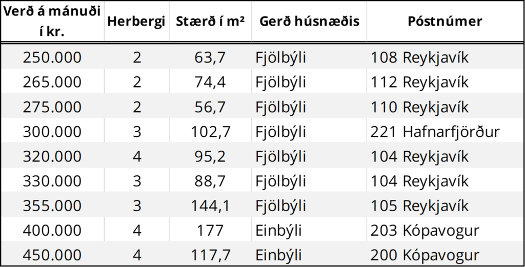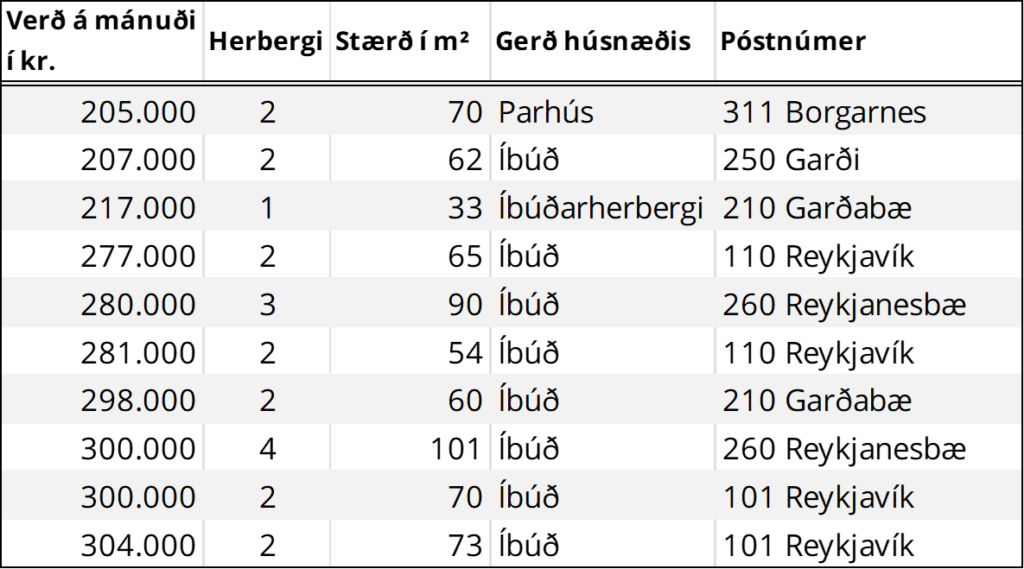 Á töflunni er yfirlit yfir níu ódýrustu íbúðir til leigu á fasteignavef Vísis 15. ágúst 2023. Töflunni er skipt í 5 dálka, verð á mánuði í kr., fjöldi herbergja, stærð í fermetrum, gerð húsnæðis og póstnúmer. Íbúðunum 9 er raðað eftir þeirri ódýrustu að þeirri dýrustu. Ódýrasta íbúðin er leigð á 250.000 kr., 2 herbergi, 63,7 fermetrar, fjölbýli, staðsett í 108 Reykjavík. Sú næsta er leigð á 265.000 kr., 2 herbergi, 74,4 fermetrar, fjölbýli, í 112 Reykjavík. Þriðja íbúðin er leigð á 275.000 kr., 2 herbergi, 56,7 fermetrar, fjölbýli, í 110 Reykjavík. Fjórða íbúðin er leigð á 300.000 kr., 3 herbergi, 102,7 fermetrar, fjölbýli, í 221 Hafnarfirði. Fimmta íbúðin er leigð á 320.000 kr., 4 herbergi, 95,2 fermetrar, fjölbýli, í 104 Reykjavík. Sjötta íbúðin er leigð á 330.000 kr., 3 herbergi, 88,7 fermetrar, fjölbýli, í 104 Reykjavík. Sjöunda íbúðin er leigð á 355.000 kr., 3 herbergi, 144,1 fermetrar, fjölbýli, í 105 Reykjavík. Áttunda íbúðin er leigð á 400.000 kr., 4 herbergi, 177 fermetri, einbýli, í 203 Kópavogi. Níunda íbúðin er leigð á 450.000 kr., 4 herbergi, 117,7 fermetrar, einbýli, í 200 Kópavogi.