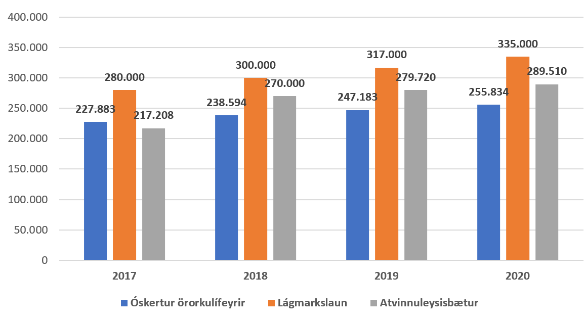 Í samanburði á mynd 1 og 2 hér á undan má sjá að lífeyrir [1] almannatrygginga hefur hækkað enn minna en atvinnuleysisbætur síðustu ár, hvort heldur litið er til krónutölu- eða prósentuhækkanna. Munar þar mestu um að atvinnuleysisbætur voru hækkaðar um 12.460 kr. (18,7%) frá 1. maí 2018 til viðbótar við 4,7% hækkun frá 1.1.2018. Það er engin vafi á nauðsyn þess að hækka atvinnuleysisbætur, bæði þá og nú. Hins vegar er ekki síður brýnt að hækka lífeyrir almannatrygginga að minnsta kosti til jafns við atvinnuleysisbætur og á sömu forsendum (sama rökstuðning) og hækkun grunnatvinnuleysisbóta, til að koma til móts við þennan viðkvæma hóp á þessum erfiðu tímum og þó fyrr hefði verið. Lág framfærsla örorkulífeyrisþega hefur stuðlað að jaðarsettningu þeirra í samfélaginu. Öfugt við atvinnu- leysisbætur er örorkulífeyri iðulega framfærsla til lengri tíma og fyrir hluta öryrkja eina framfærsla þeirra.