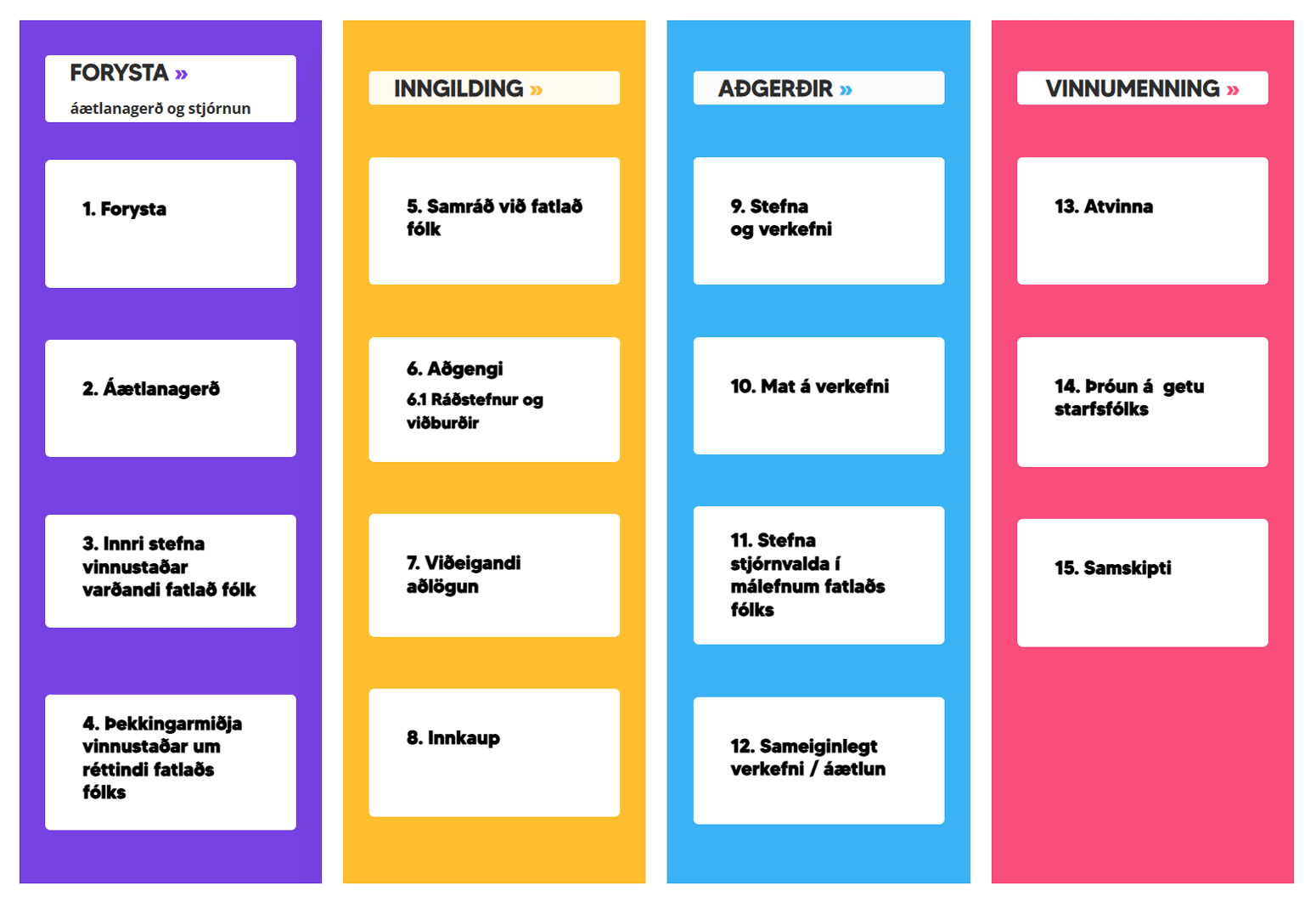 Innan vinnustaðar skal tryggja inngildingu fatlaðs fólks og viðeigandi aðlögun gerð hluti af  stefnu og markmiðum.